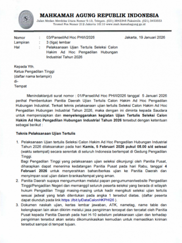 ⚠️ Hati-hati terhadap penipuan yang mengatasnamakan Mahkamah Agung. | 1. Mahkamah Agung tidak melakukan komunikasi baik lisan maupun tertulis dengan pihak berperkara. | 2. Semua komunikasi yang berkaitan dengan penyelesaian perkara meliputi informasi kekurangan berkas, registrasi perkara, dan pemberitahuan salinan putusan disampaikan melalui pengadilan pengaju. | 3. Pengadilan pengaju akan menyampaikan kepada pihak berperkara melalui petugas resmi yang ditunjuk sesuai peraturan perundang-undangan. | 4. Cek info perkara Anda hanya di: https://kepaniteraan.mahkamahagung.go.id/perkara .