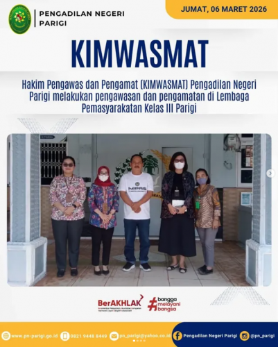 Hakim Pengawas dan Pengamat (Wasmat) Pengadilan Negeri Parigi, didampingi oleh Plt. Panitera Muda Pidana, melaksanakan kegiatan pengawasan dan pengamatan di Lapas Kelas III Parigi. Kegiatan ini merupakan bagian dari pelaksanaan tugas pengawasan terhadap pelaksanaan putusan pengadilan serta sebagai sarana koordinasi dengan pihak lembaga pemasyarakatan dalam rangka memastikan pembinaan narapidana berjalan dengan baik.